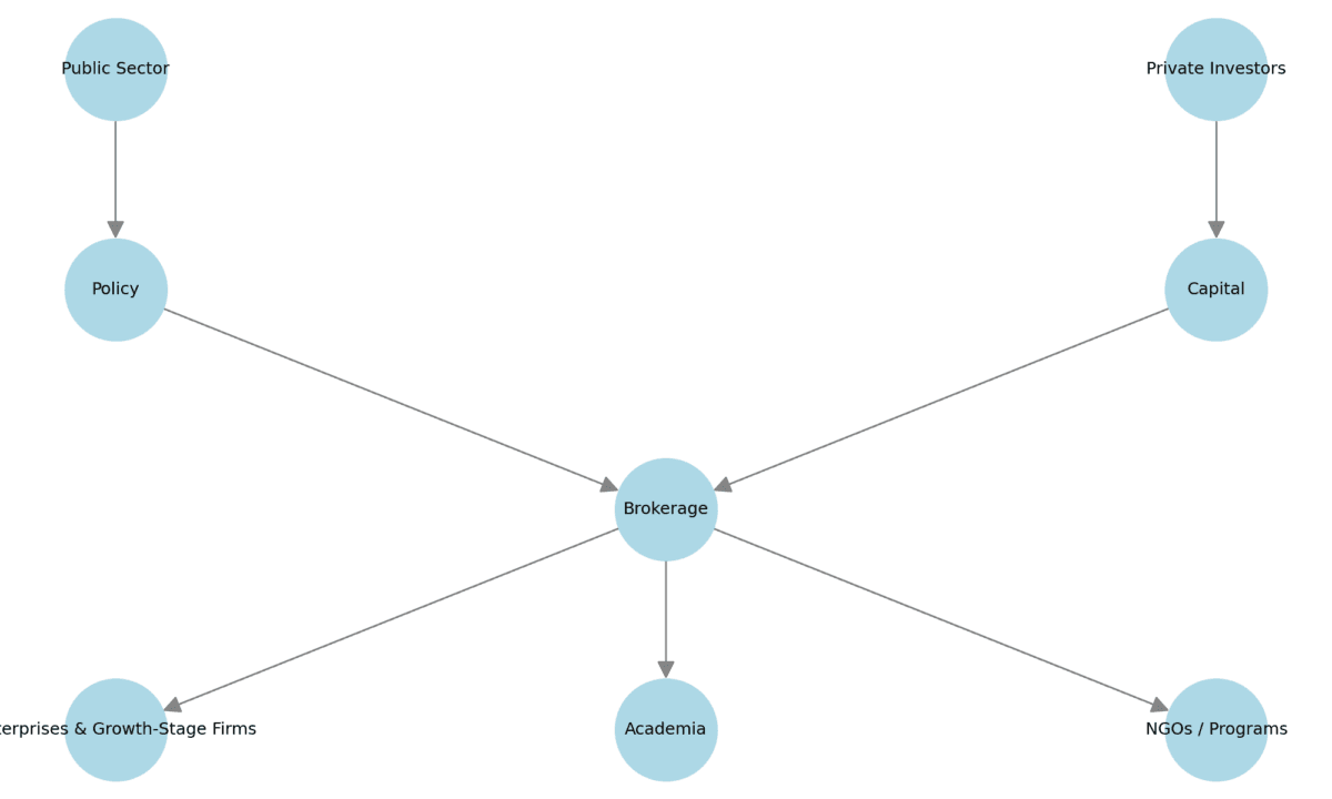 Diagram: Strategic brokers sit at the center of policy, capital, academia, enterprises & growth‑stage firms, and donor programs — translating needs, removing friction, and building alignment.
